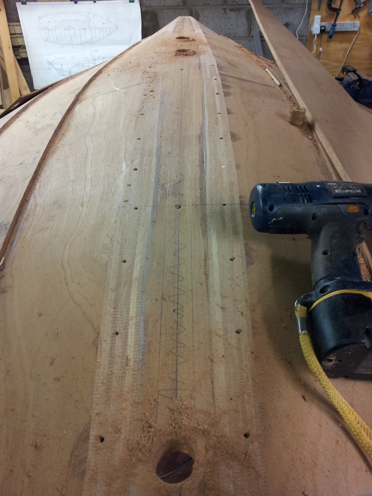 Once the epoxy had set, I removed the clamps this morning and re-checked alignment - measuring top of the trunk from each sheer plank to confirm symmetry. It was rock solid and within 1 mm from sheer to sheer - all told a satisfactory result for the first time wooden boat builder!